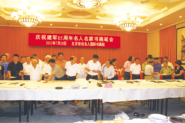 2012年7月28日,北京世纪名人国际书画院在全国政协礼堂举办“庆祝中国人民解放军建军85周年名人名家书画笔会”,著名书法大家欧阳中石(左)、李铎(右)共同开笔挥就巨幅榜书:“大美华章”、“泽被阳和”。